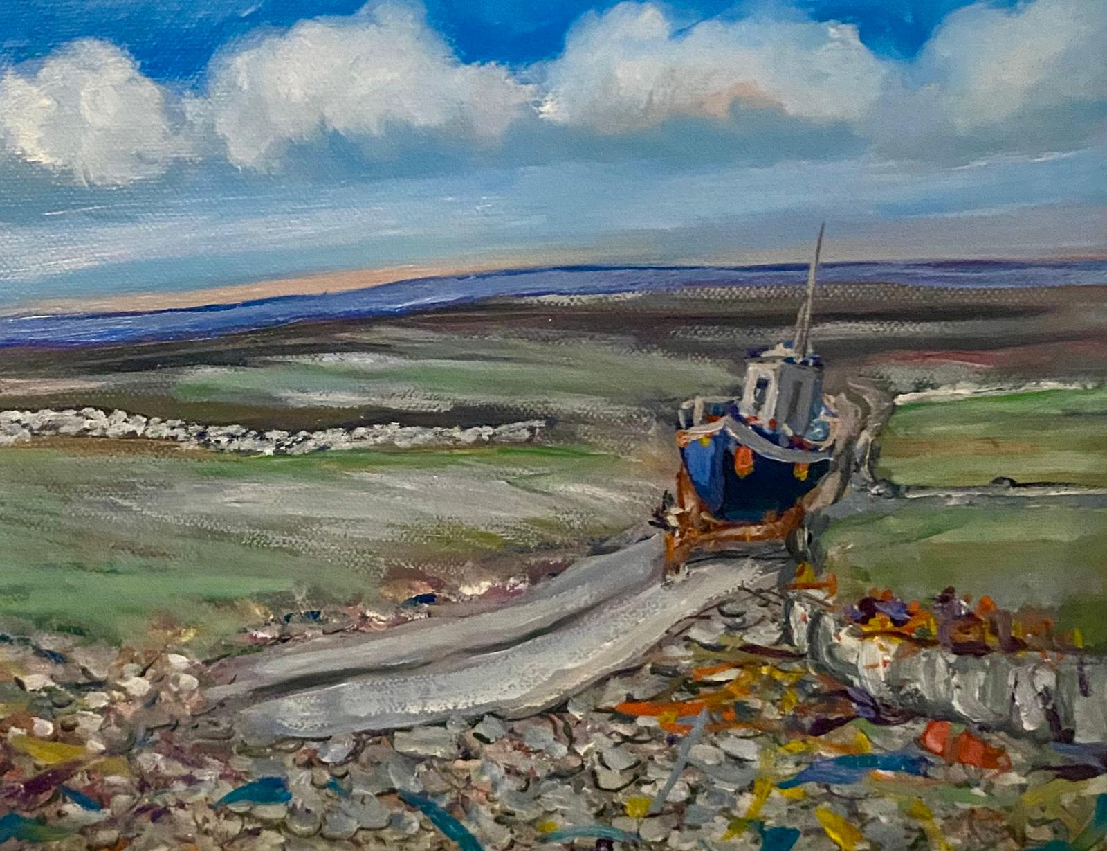 Original oil painting of the Burren boat in Ballyvaughan, Burren, Co. Clare. Painting size is 30cmx25cm.